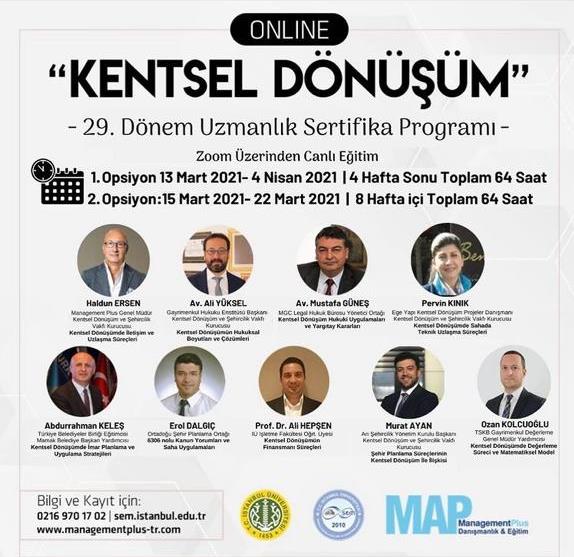 29. Dönem “Kentsel Dönüşüm Uzmanlık Sertifika Programı” İstanbul Üniversitesi SEM işbirliği ile 13 Mart hafta sonu ve 15 Mart hafta içi programı olarak 2 opsiyonlu olacak şekilde zoom dan online olarak başlıyor.
