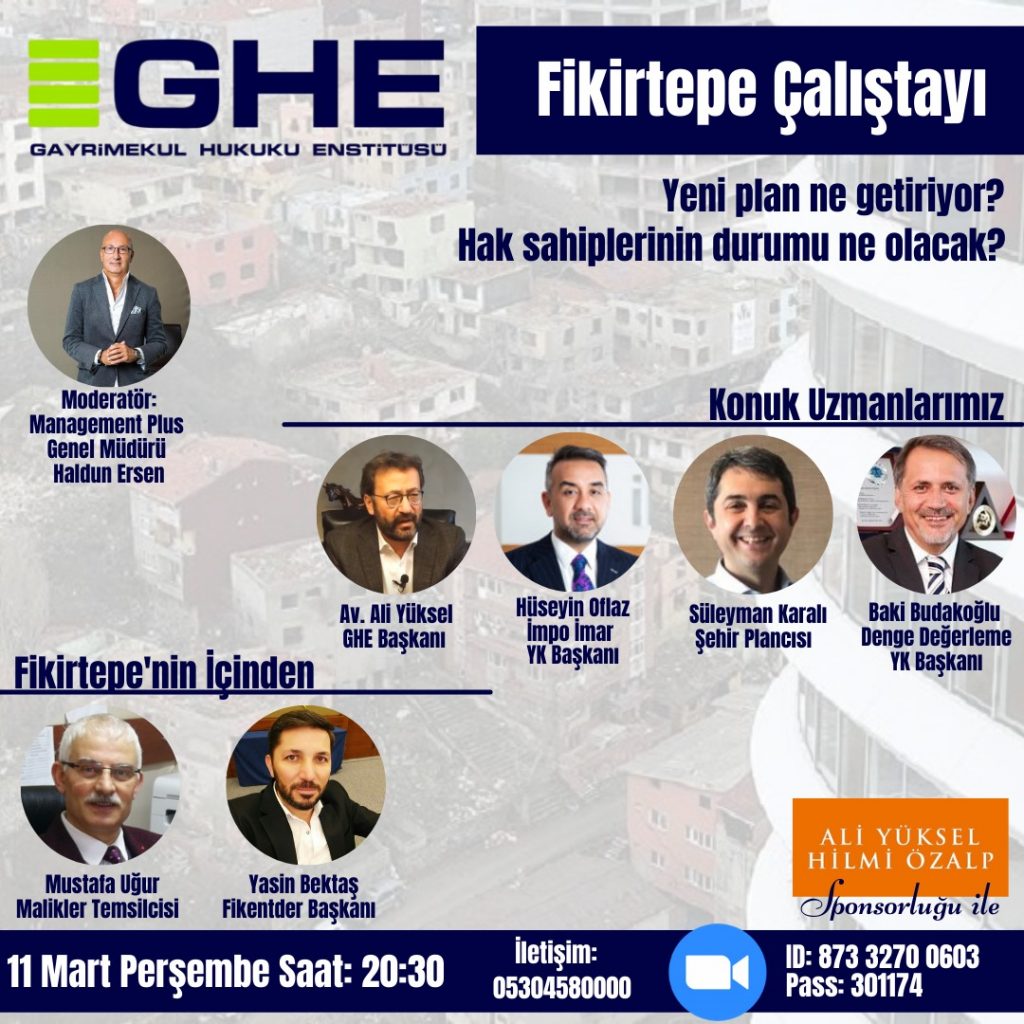 Gayrimenkul Hukuku Enstitüsünün 11 Mart Perşembe günü saat 20.30 da zoom üzerinden yapacağı Fikirtepe Çalıştayı