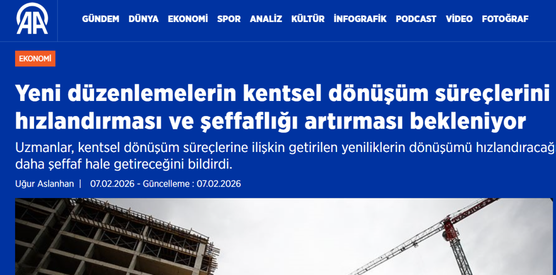 Anadolu Ajansında Dr. Av. Ali Yüksel’in röportajı yayınlandı.Yeni düzenlemelerin kentsel dönüşüm süreçlerini hızlandırması ve şeffaflığı artırması bekleniyor.